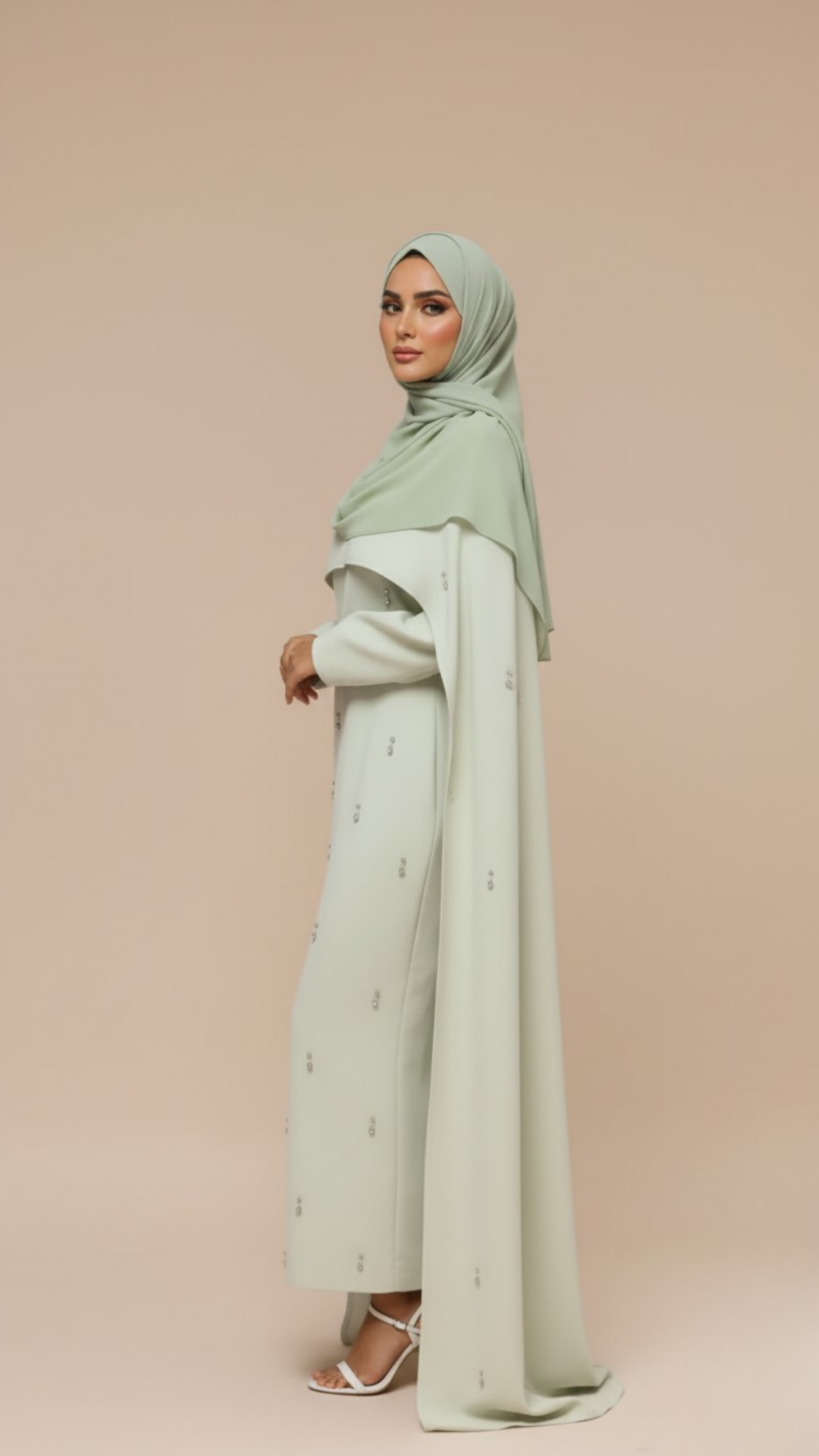 The Cape Maxi Dress in Sage Green — a flowing silhouette with pearl details and a cape overlay. Designed for weddings and celebrations, it’s the essence of modern modest luxury.