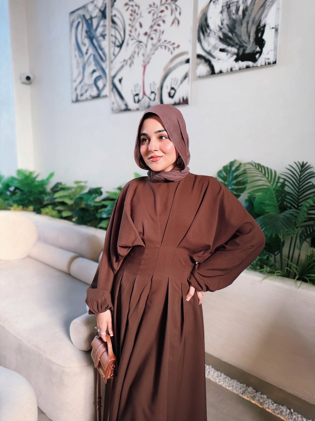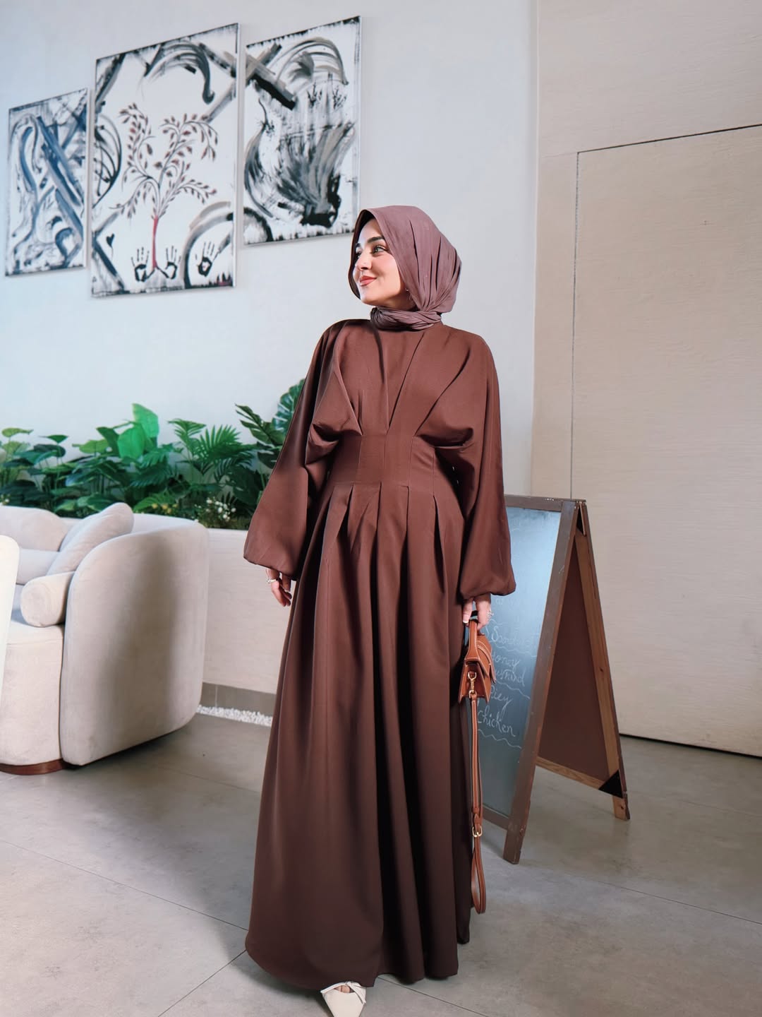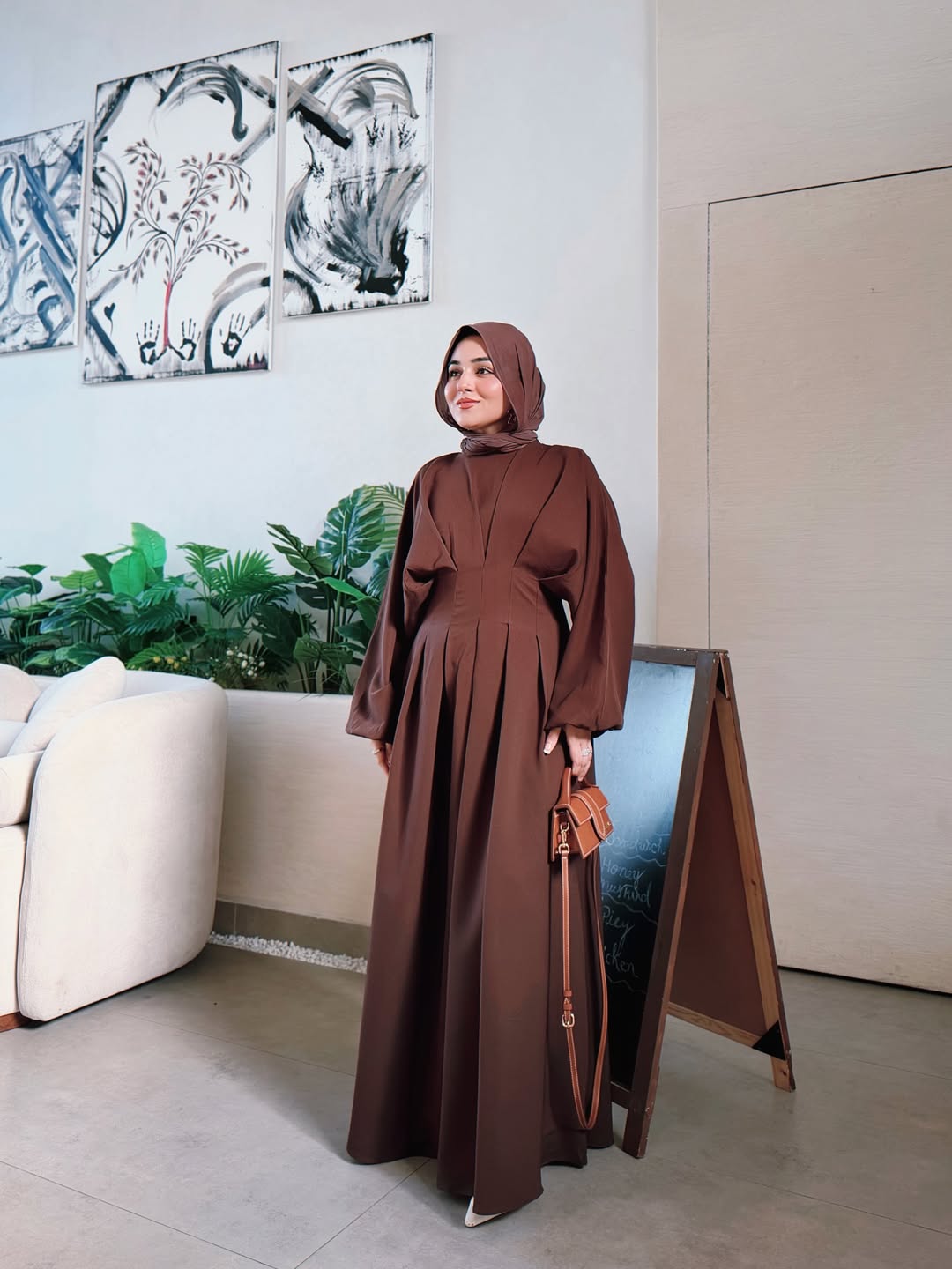 This dark brown maxi dress is crafted for evenings, events, and gatherings. With clean tailoring, fluid drape, and statement sleeves, it brings effortless sophistication to every occasion.