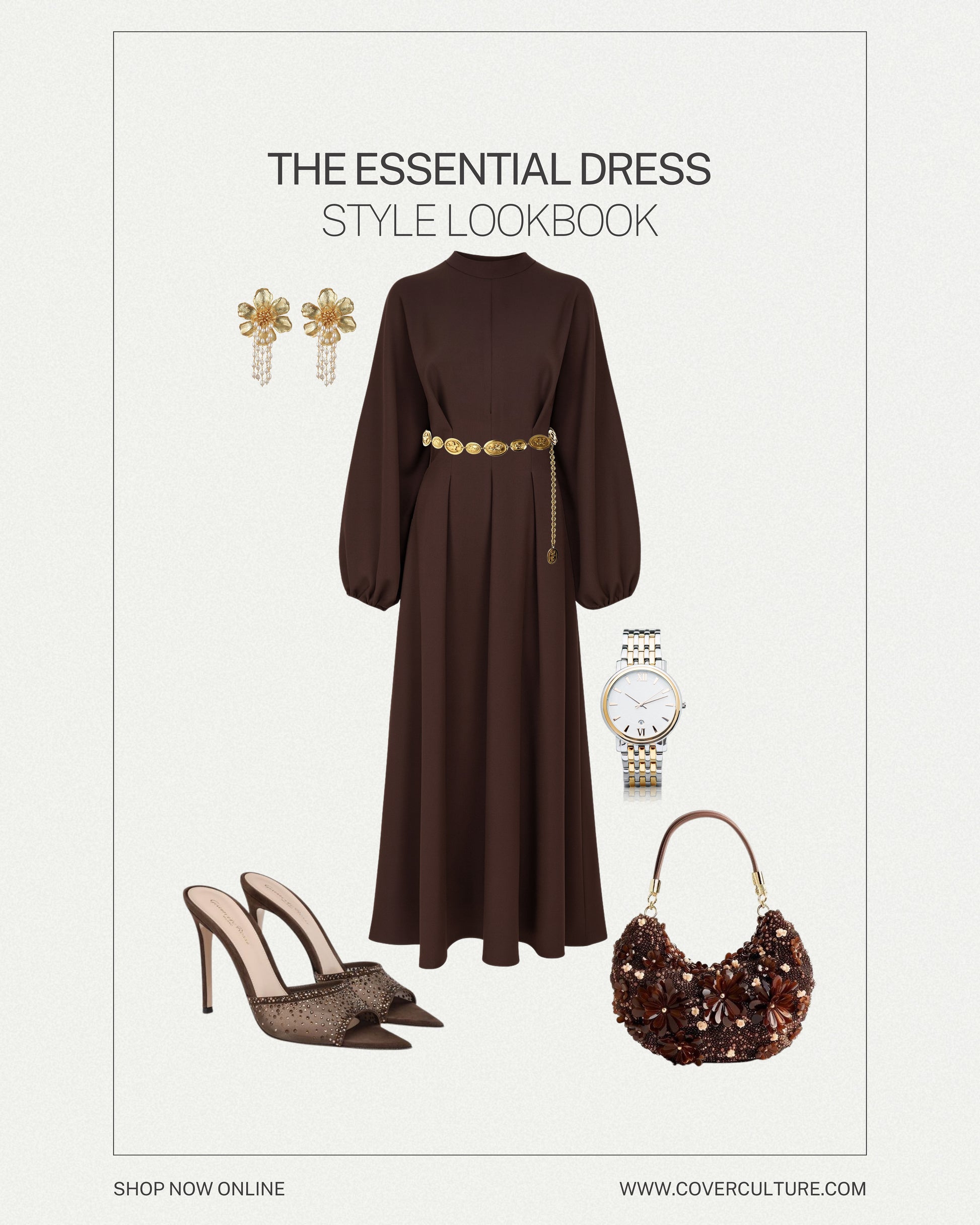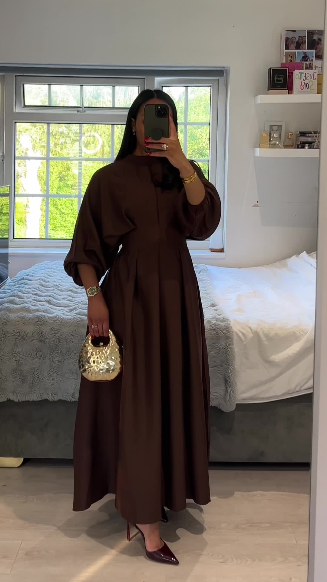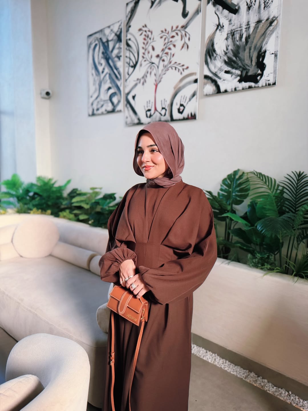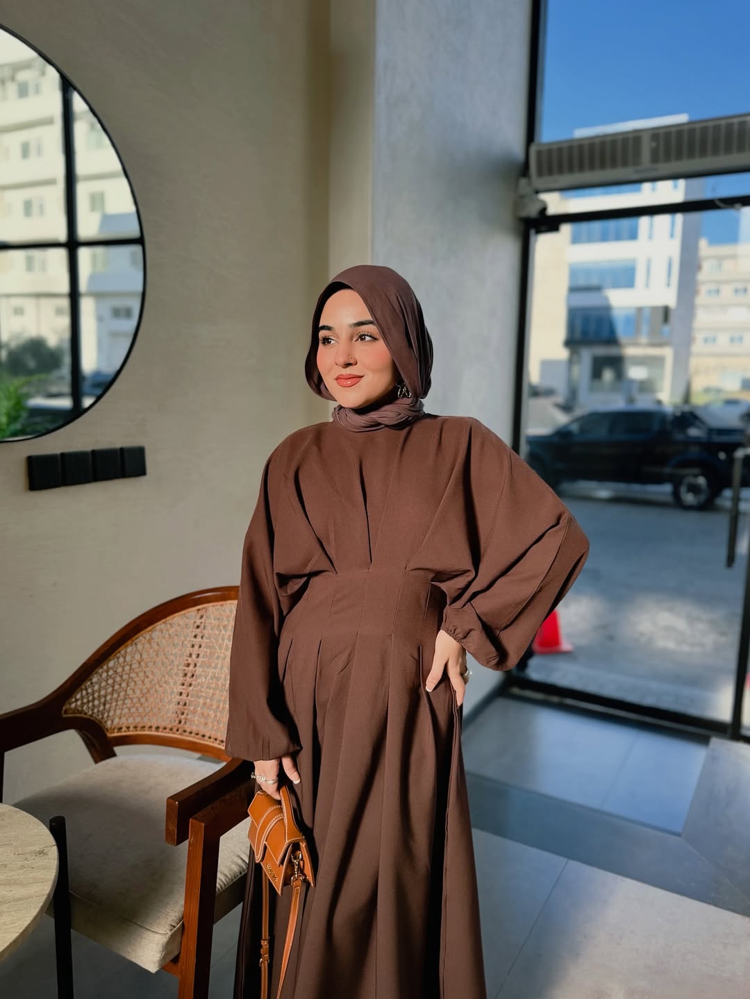 This dark brown maxi dress is crafted for evenings, events, and gatherings. With clean tailoring, fluid drape, and statement sleeves, it brings effortless sophistication to every occasion.